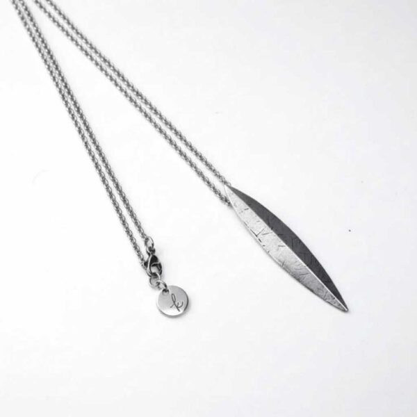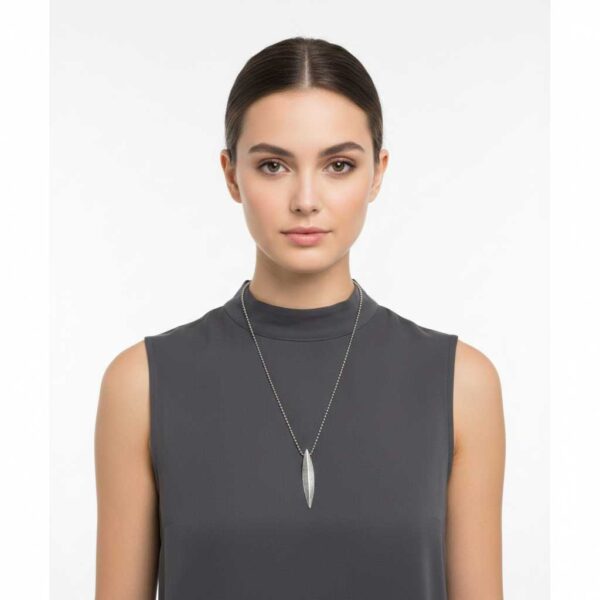 Collar Botánica con colgante de hoja texturizada en plata y cadena de acero inoxidable. Diseño elegante y versátil que estiliza cualquier look con un toque natural y sofisticado.