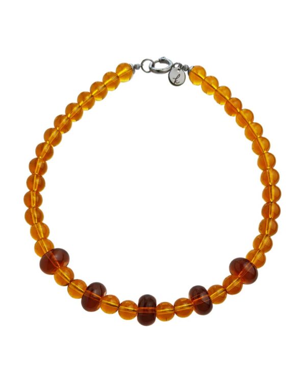 Cada cuenta de cristal y resina en color ámbar refleja la luz con sutileza, evocando la sensación del sol al caer sobre la piel. El cierre de acero inoxidable aporta durabilidad y un acabado elegante, manteniendo el estilo boho y contemporáneo que caracteriza nuestras creaciones.