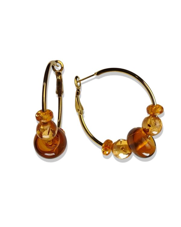 Reflejan la calidez del sol y la serenidad de la tierra. Estos pendientes de aro, elaborados en acero dorado de 40 mm, combinan cuentas de cristal y resina en tonos ámbar que evocan la luz de las tardes doradas. Cada detalle ha sido cuidadosamente seleccionado para transmitir una sensación de armonía y naturalidad, haciendo de estos pendientes un accesorio que no solo adorna, sino que también inspira.